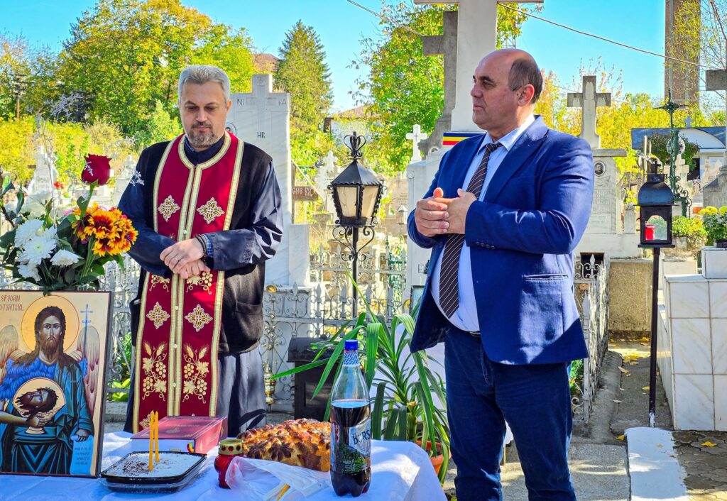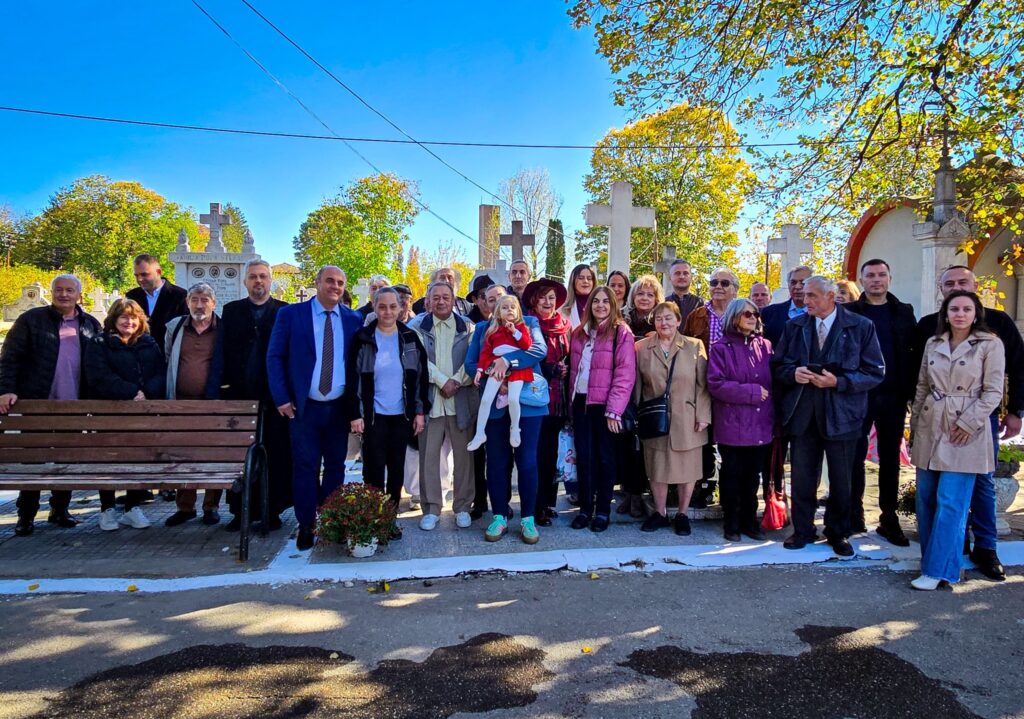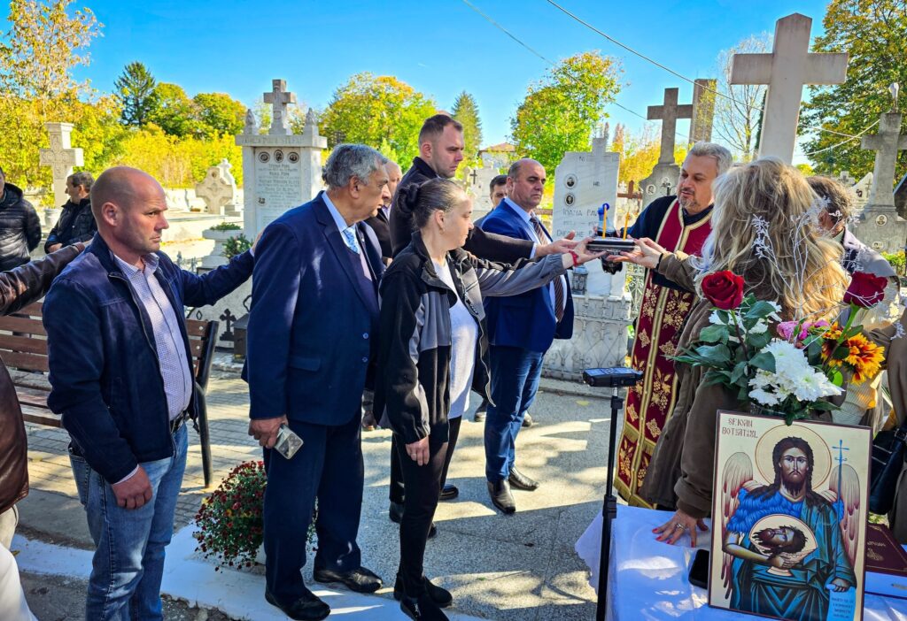 Dimineața de duminică a fost binecuvântată cu un cer senin de un albastru intens, specific toamnei valcene. Soarele blând filtra prin frunzele galbene și verzi ale copacilor seculari din cimitir, proiectând umbre lungi și dansante pe aleile pavate. Temperatura plăcută a permis participanților să se adune în ținute de toamnă – costume elegante, jachete și pulovere -, creând un contrast viu cu albul crucilor de marmură și verdele vegetației.