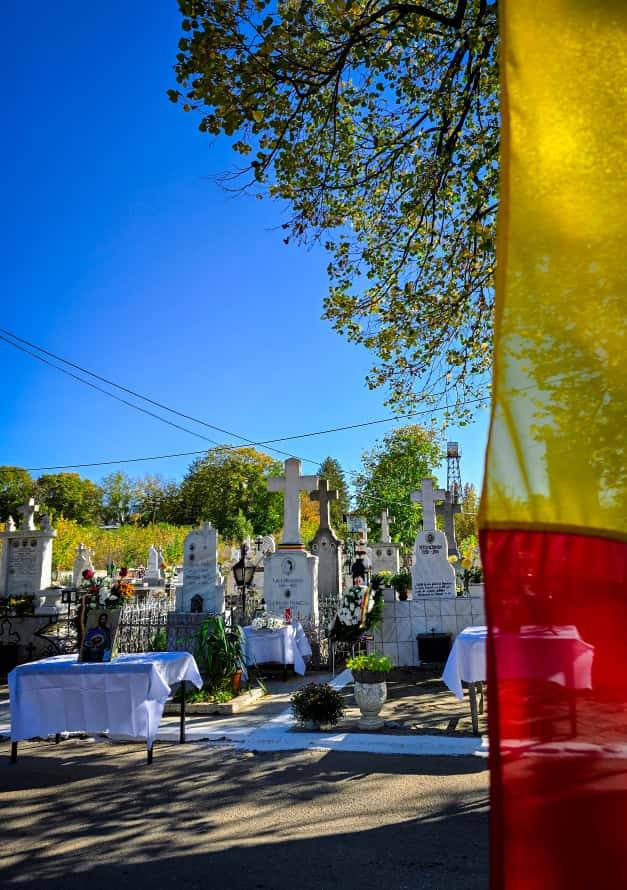 Lumina caldă a dimineții conferea întregii scene o aură aproape pictorală, transformând cimitirul într-un loc de pace profundă și reflecție spirituală. Frunzele căzute pe pavaj, în nuanțe de galben și ocru, completau tabloul tomnatic perfect pentru o ceremonie dedicată memoriei culturale.